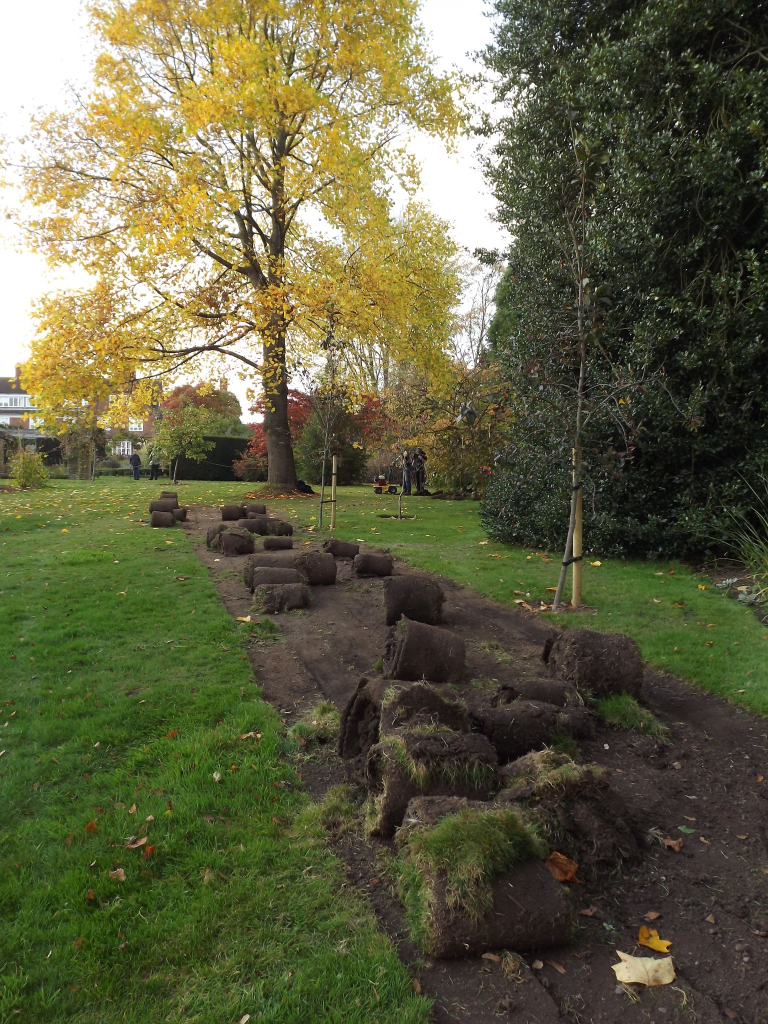 On Monday we began lifting turf on the Arboretum Lawn where two large new borders will be created over the winter. The project began several weeks ago when the Garden Team planted fifteen specimen trees in the area as part of an exciting new design that will transform the space.