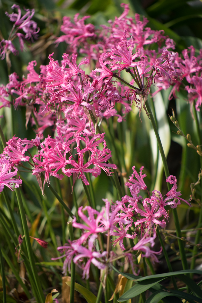 Nerines are without a doubt the most spectacular of the autumn flowering bulbs and ours are looking stunning in the Walled Garden and South African Bulb Bed at the moment. A native of South Africa, they are truly exotic but don’t let that put you off. The hardiest (Nerine bowdenii) has been grown in this country since 1903, is hardy down to -15, and extremely easy to grow.