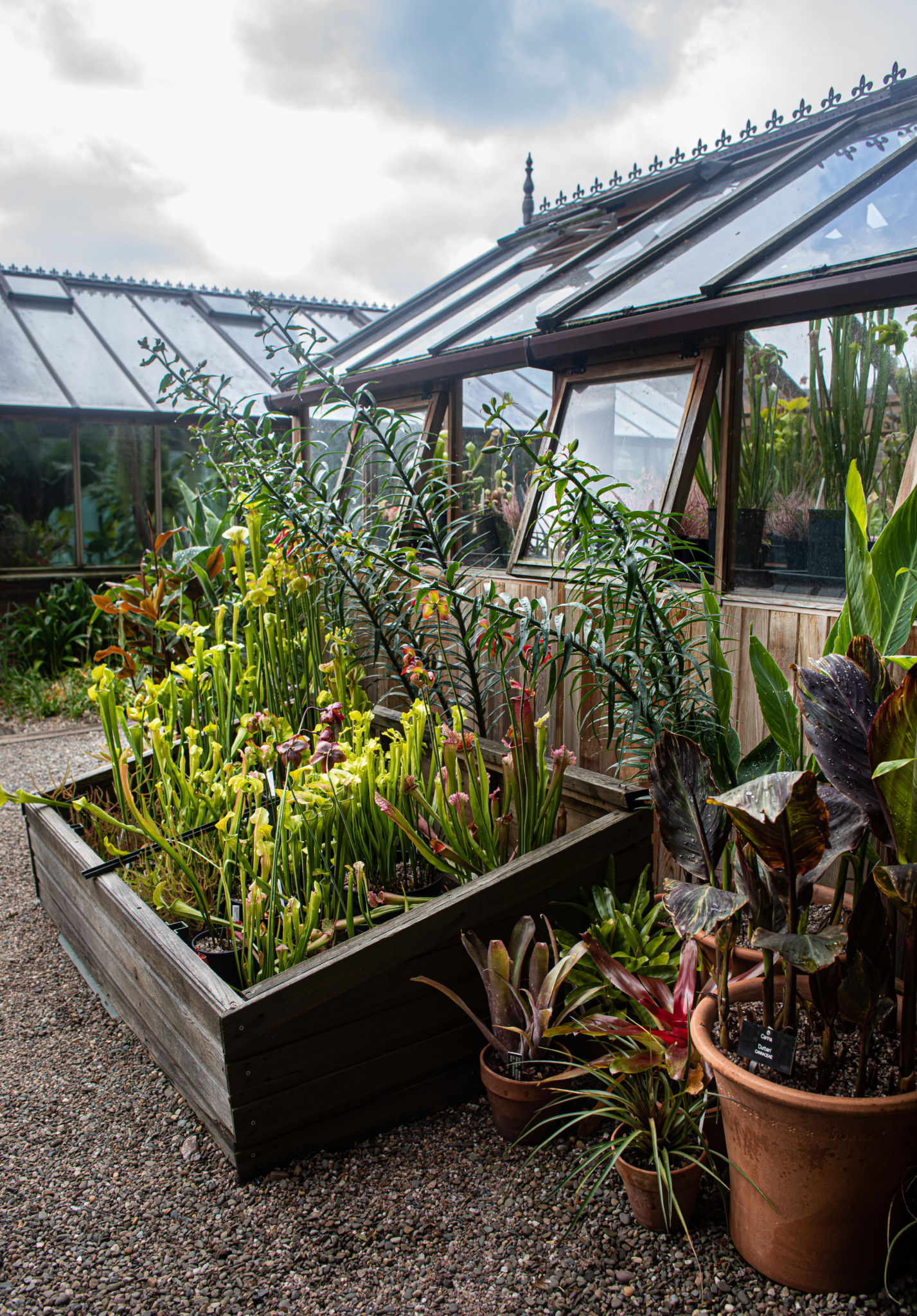 Glasshouse Area Supervisor Abby has been busy creating a brilliant tropical looking display outside the Carnivorous Plant House using bromeliads, cannas and giant ginger lilies. At the center of it all is a new carnivorous plant frame filled with flowering North American pitcher plants (Sarracenia).