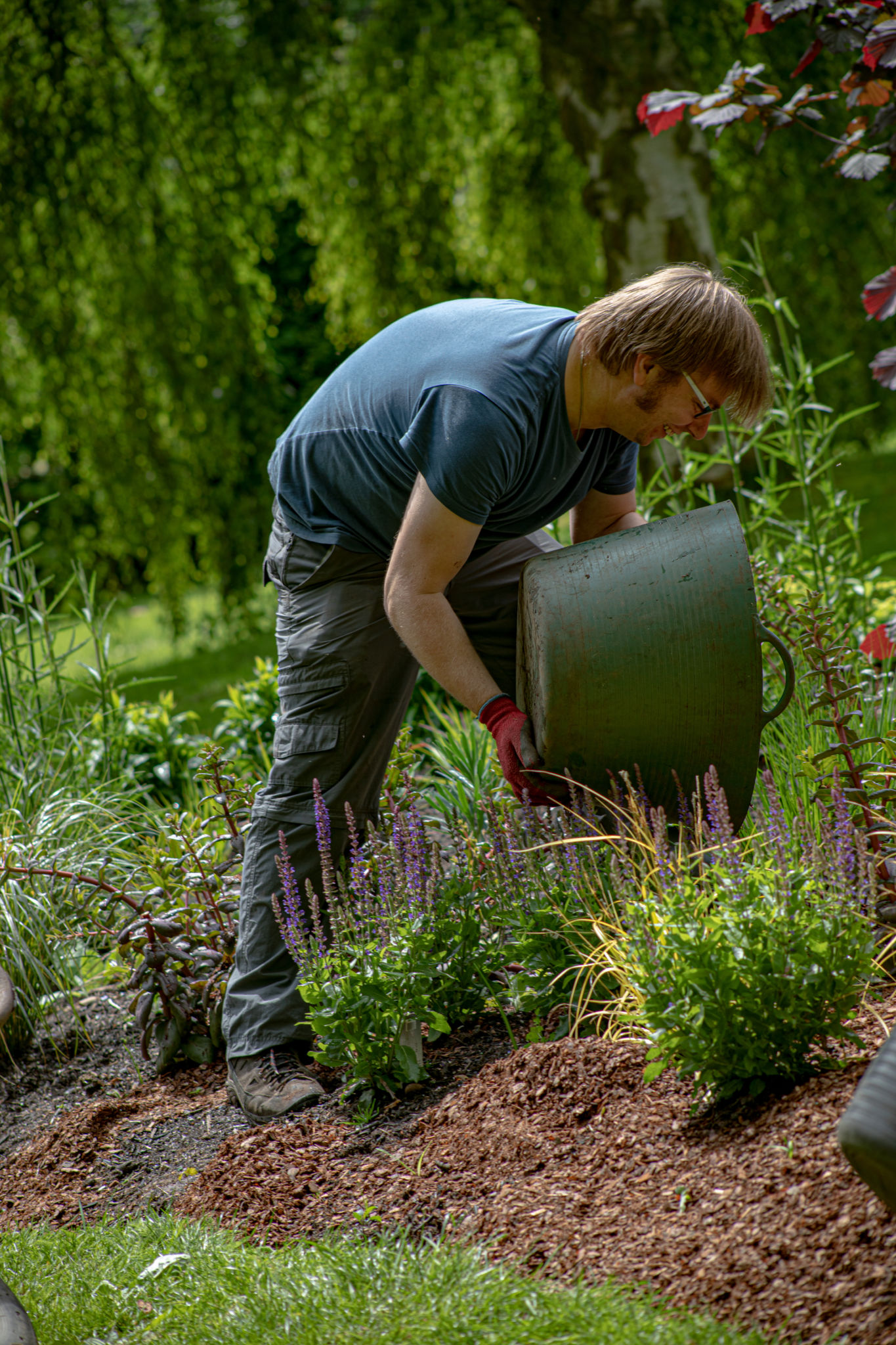 Garden Volunteers Mike and Meryl were mulching our new Arboretum Lawn Borders on Wednesday. Now that all of the spring planting has been completed, the Garden Team will be applying 20 tons of fine pine bark ‘mini-chip’ at a depth of about 2 inches between the newly planted plants.