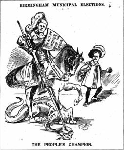 However, the Birmingham Mail supported John, in view of his achievements with the Housing Committee. This cartoon portrays John as St. George, slaying the “dragon” of poverty through housing reform.